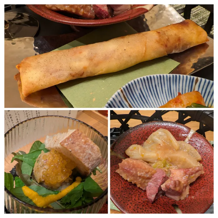 富士サーモンのタルタル自家製漬けいくらのせ⭐️天然いのししほほ肉と肩ロースの白味噌煮込み⭐️いちじくとクリームチーズの春巻き⭐️秋野菜のカポナータ⭐️マッシュルームのプリン⭐️れんこんの実山椒炒め⭐️茗荷とささみのもずく酢あえ⭐️