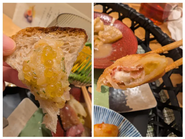 クリームチーズの春巻、ボリューム満点💯そして旨⤴大好き⤴わたしはお酒は飲めませんが、きっと白ワインが合うと思いますぅ😋富士サーモンのタルタルはバケットにのせて〜🤤