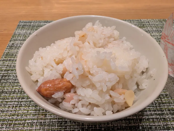 昨年はこの生落花生はお豆腐で頂きました〜今回は炊き込みご飯🤤お塩のみでの味付けのだそうで、これが美味くて美味くて🏋️モリモリたべちゃいました!落花生の食感がたまらん🤤